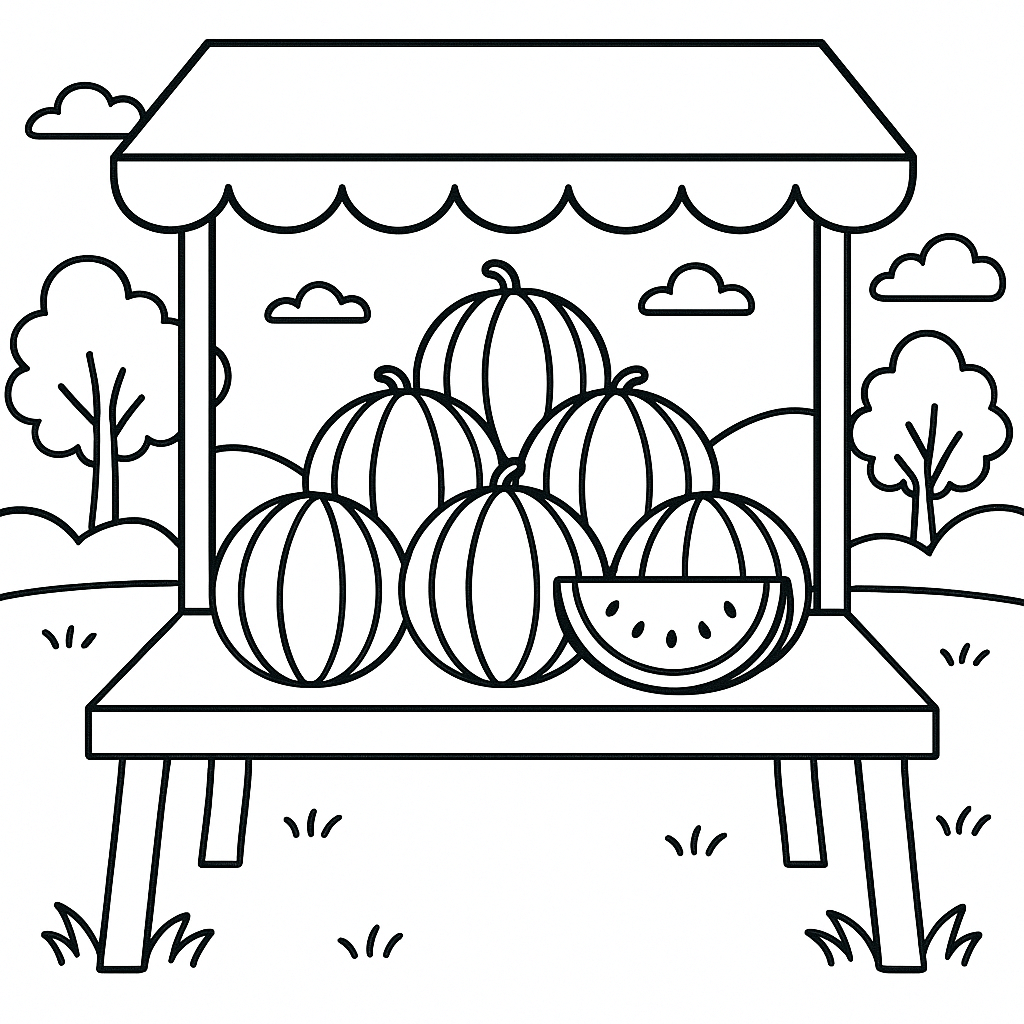 Una scena di mercato con tante angurie in vendita: riempile di colori vivaci!
