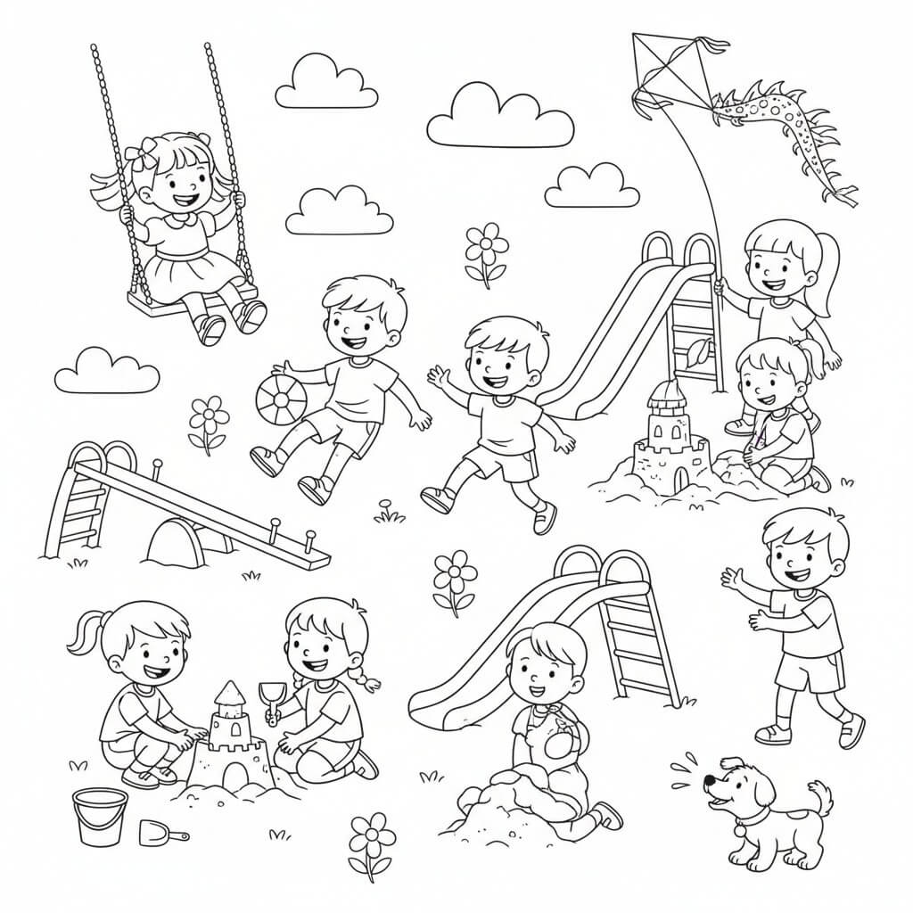 Scopri questa raccolta allegra con bambini che giocano e imparano. Dai momenti sportivi alle attivita creative, ogni scena e perfetta per colorare e divertirsi.