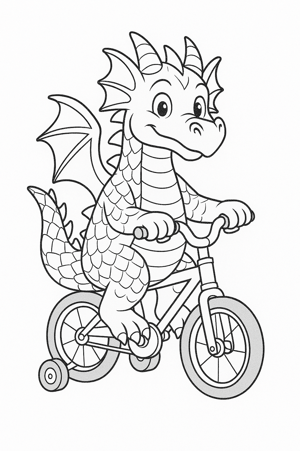 Un drago insolito che pedala felice, un mix di fantasia e divertimento.