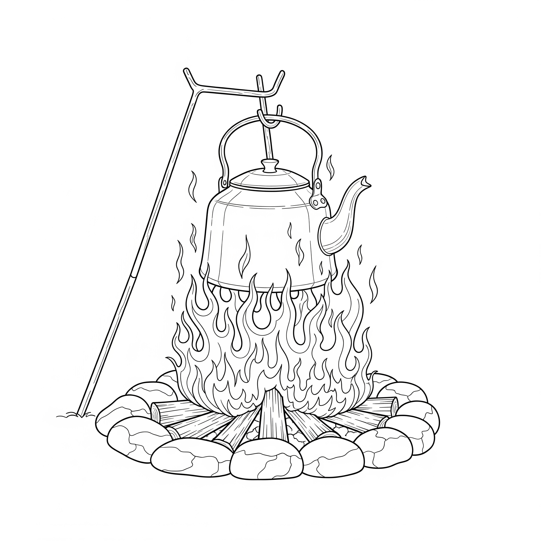 Una pentola appesa sopra il fuoco in una scena rustica da campeggio.