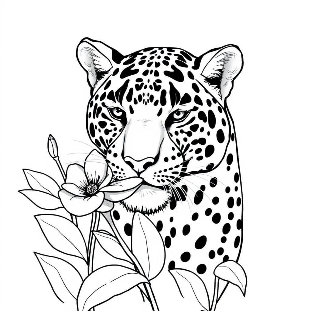 Un giaguaro curioso vicino a un fiore, perfetto per colori naturali.