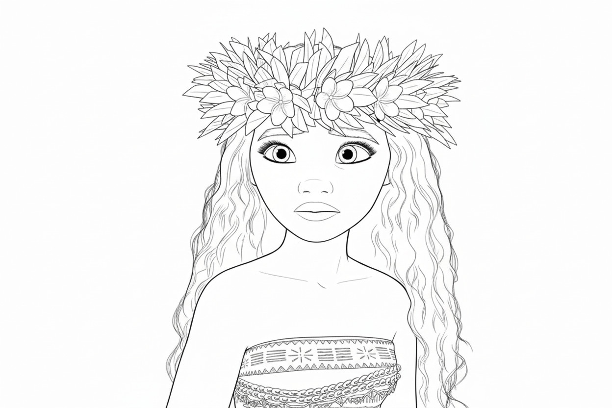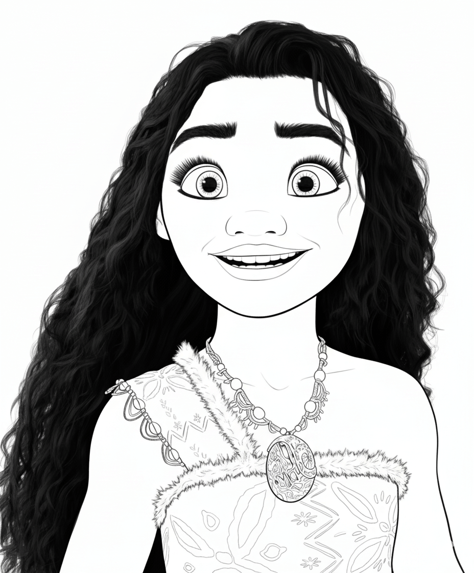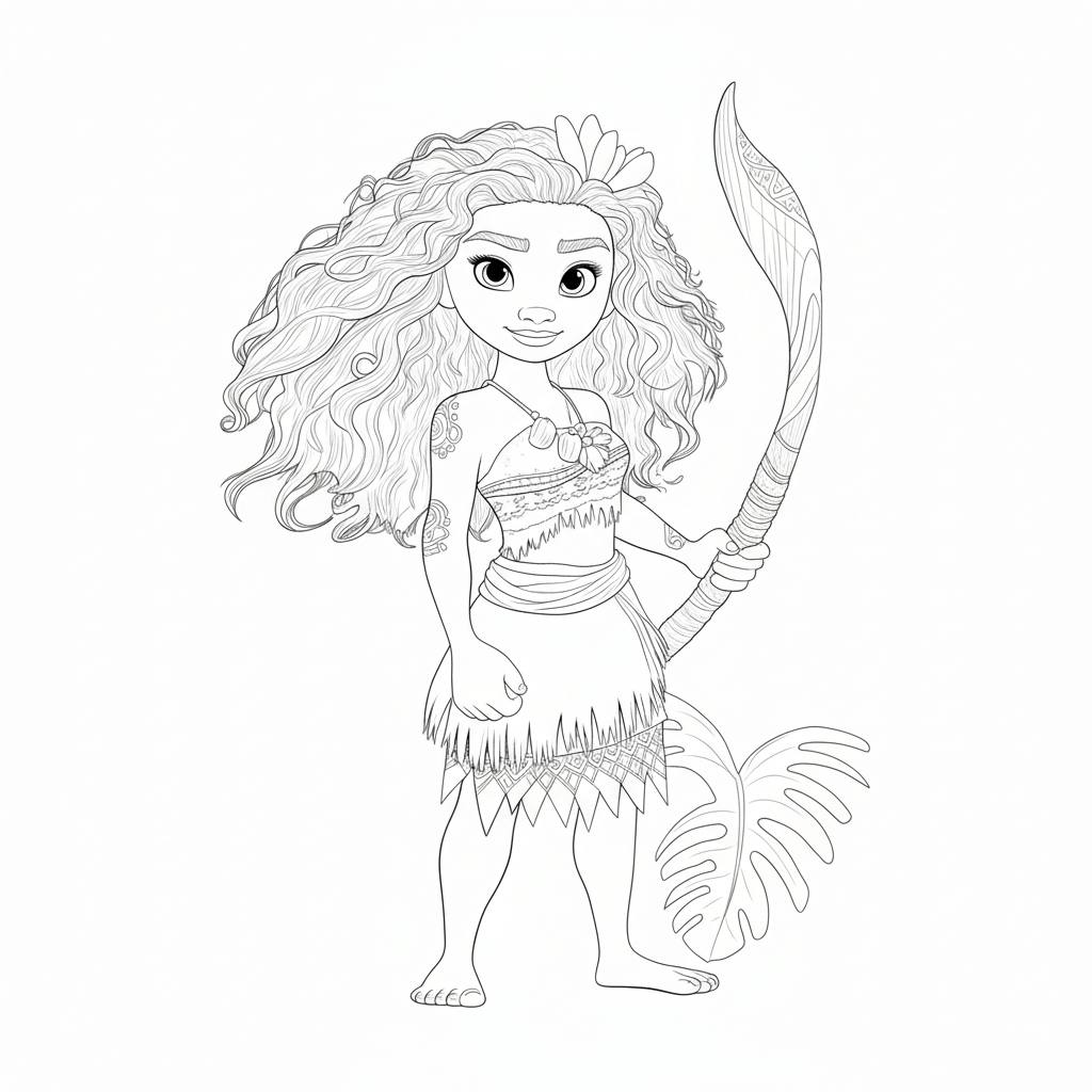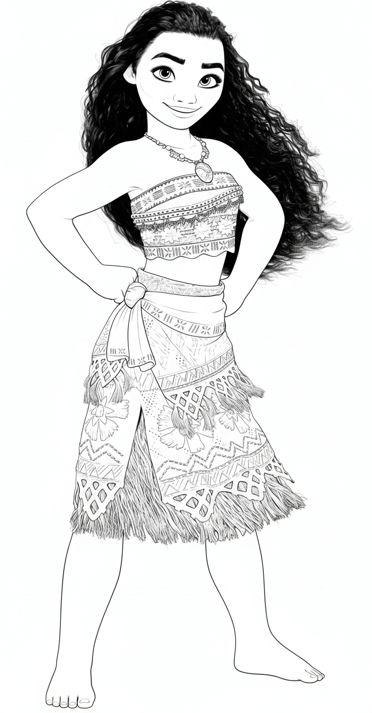 Versione classica di Moana con i capelli lunghi al vento, perfetta per colori naturali e dettagli tropicali.