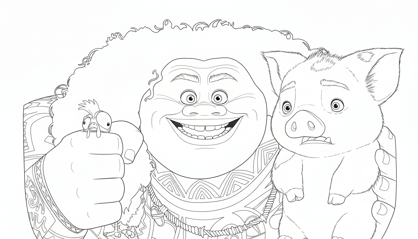 Accompagna Moana, Maui, Pua e Heihei nelle loro avventure sull'oceano. In questa raccolta trovi disegni da colorare con pagaia, corona, amici e scene magiche. Scegli il tuo preferito, stampa e colora: perfetto per piccoli fan e per chi ama l'atmosfera tropicale.