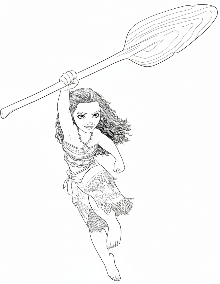 Moana sta in riva al mare con la sua pagaia, pronta ad affrontare le onde. Ideale per blu e turchesi vivaci.