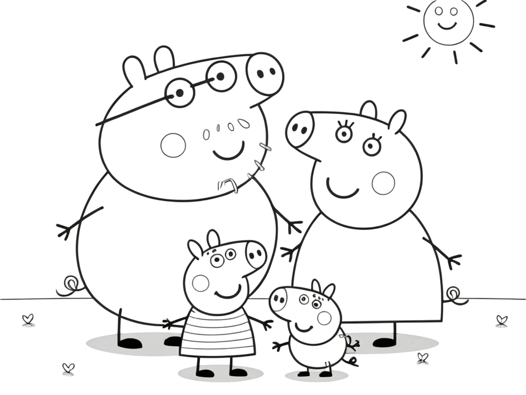 Peppa, George, Mamma Pig e Papa Pig insieme come famiglia felice, perfetto per colorare ogni personaggio con un colore diverso.